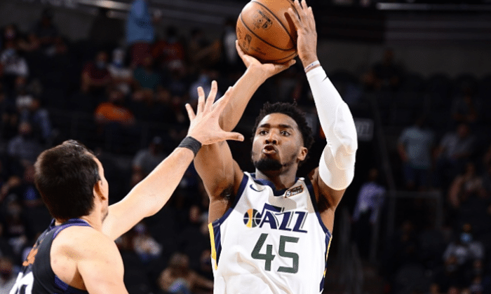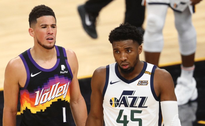 第四节还剩下10.4秒的时候,爵士落后3分,米切尔迎着2个人的防守直接出手三分球命中,帮助球队扳平了比分,而且之后布克的绝杀不中,这个时候的米切尔是绝对的英雄。