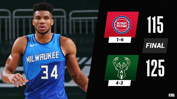 雄鹿125-115战胜活塞 字母哥43分创个人赛季新高