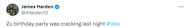 哈登还发推晒出多张对阵骑士的赛场照,配文写道:昨晚,祖巴茨的生日派对太热闹了;晒自己背后大帽对手时与邓恩同框照,写道:邓恩也收到了一些生日礼物。