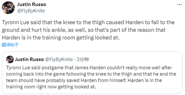 赛后谈到哈登伤势,泰伦-卢表示,在那一下对抗之后,哈登就没法移动了,期间哈登也扭伤了脚踝;也许球队应该让哈登不要再登场的,但是哈登本人想要留在比赛中。