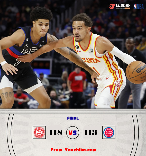 jrs直播网讯10月27日讯 NBA常规赛老鹰对阵活塞,老鹰上场比赛不敌黄蜂遭遇赛季首败,活塞则是最近遭遇3连败。上半场老鹰靠着亨特和特雷-杨两人的发挥取得领先,康宁汉姆状态不错联手博格达诺维奇努力追分,第二节老鹰手感有所下降,活塞在康宁汉姆的带领下迫近比分,上半场老鹰只领先1分。下半场回来活塞一度完成反超,但老鹰及时调整在特雷-杨的带领下夺回领先,最终老鹰118-113力克活塞。