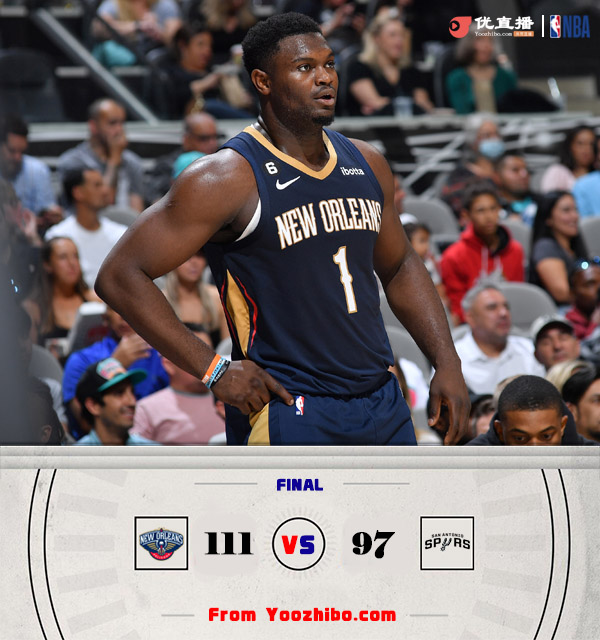jrs直播网10月10日讯 NBA季前赛,马刺对阵鹈鹕。马刺想要得到文班亚马的心已经路人皆知,鹈鹕这边续约麦科勒姆和锡安后继续保持一定的竞争力。一开场,鹈鹕率先发力取得领先,马刺奋力反击,首节结束鹈鹕领先4分。第二节,双方继续缠斗,比分咬得很紧,半场战罢鹈鹕50-44领先6分。下半场,马刺一度将比分扳平,但此后突然断电,鹈鹕一波14-0的进攻高潮领先21分进入末节。第四节,双方轮换阵容旗鼓相当,鹈鹕轻松将优势保持到了最后。最终,鹈鹕111-97轻取马刺,顺利过关。