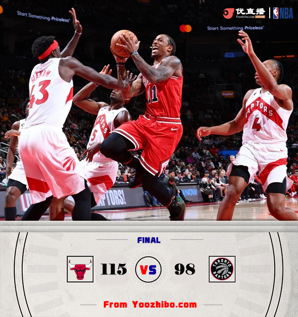 jrs直播网讯 10月10日讯 NBA季前赛继续进行,猛龙主场迎战公牛,季前赛猛龙目前2胜1负,公牛则是1胜1负,双方全主力出战。开局猛龙就迅速进入比赛状态,范弗里特联手特伦特有内有外帮助猛龙迅速拉开比分,公牛则是靠德罗赞支撑起进攻,首节猛龙领先到双位数,次节猛龙替补也是保持不错的手感稳住优势,但双方命中率都有下降,德罗赞一度帮助公牛追到差5分,但猛龙众将依靠冲击力造杀伤稳住10分领先。第三节,德罗赞继续稳定发挥,拉文外线也连续发炮,两人联手带领公牛打出两波攻击波一举反超比分,但猛龙也顶住压力回应上咬住比分,依靠埃尔南戈麦斯的三分还保持领先,末节双方换上替补练兵,公牛依靠不错的外线手感重新夺回领先,而猛龙则是陷入得分荒,公牛抓住机会拉开双位数分差,最终公牛115-98逆转猛龙。