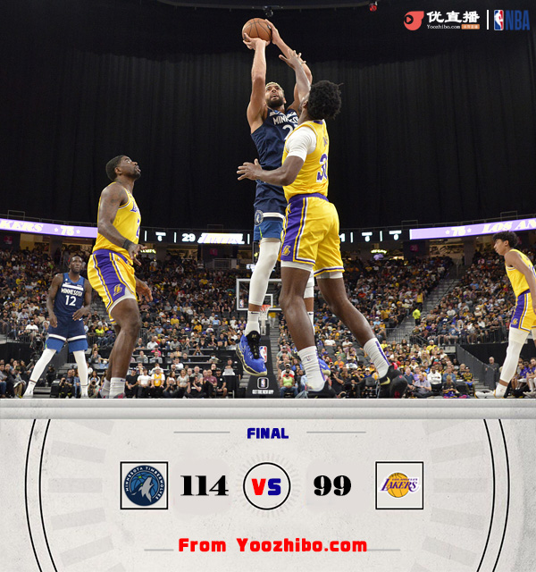 jrs直播网10月7日讯 湖人和森林狼今日迎来一场季前赛较量,上一场缺阵的戈贝尔今日首发出战,湖人方面则核心全部轮休。湖人虽然全替补但开局状态相当不错,开局8-0的攻势帮助他们一直保持着接近10分的领先,不过森林狼末段找回状态开始反击,他们首节末和次节初打出跨节14-2的攻势反超比分并取得9分领先进入下半场。下半场森林狼依旧稳压湖人一头,单节轰下36分帮助他们在第三节就拿到24分领先,巨大分差也让末节失去悬念,湖人靠着最后一波11-0的攻势稍稍挽回颜面。最终,森林狼轻取湖人取得季前赛2连胜,而湖人则遭遇3连败。