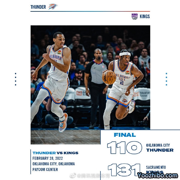jrs直播网 3月1日讯 NBA常规赛继续进行,四连败的国王客场挑战上场取胜的雷霆,西部两支排名靠后的队伍正面对话,国王目前暂列西部倒数第三,而雷霆则排在倒数第二,首节一上来双方迅速找到状态,国王内外开花逐渐占优,亚历山大首节独得14分率队回敬11-3攻击波迅速反超,末段国王连中三分夺回优势,首节结束时国王领先3分,次节回来,双方继续火热对攻,雷霆开局阶段再度反超,福克斯联手巴恩斯及时回应,半场战罢,双方战成59平。易边再战后雷霆一波9-0后一度占优,但国王多点开花逐渐反超,末段他们回敬10-0小高潮,三节结束后国王已经领先9分,末节上来,双方外线火热对飚,迪文岑佐连中三分,福克斯联手巴恩斯不断取分,比赛早早失去悬念,最终国王击败对手终结四连败。