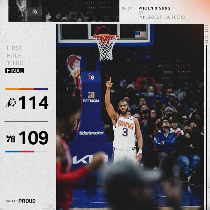 jrs直播网2月9日讯 76人今日坐镇主场迎战太阳,76人最近3战2负状态稍有下滑,而太阳除了输给老鹰外,近期其余的13场比赛全部取胜状态火热。首节之争76人在开局被动的情况下依靠恩比德连砍10分迅速追上比分,不过作为领头羊的太阳并非泛泛之辈,随后的替补轮换里他们依靠更加全面的进攻表现取得4分领先。次节76人开场一波9-2的攻势迅速追上比分,随后的激烈争夺战中,76人最后时刻再送7-2的小高潮反超4分进入下半场。下半场的拉锯战更加激烈,太阳在最多落后11分的情况下及时自救,凭借第三节后半段和第四节初的出色表现他们甚至实现反超,胶着局势也将悬念一直保留到最后,关键时刻太阳这边保罗和布克轮番打成关键球确立领先,而76人却出现致命失误错失追分机会。最终,太阳客场险胜76人迎来3连胜。