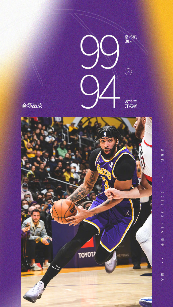湖人(25-27):戴维斯30分15篮板3封盖,安东尼24分8篮板2助攻,威斯布鲁克9分10篮板13助攻,布拉德利11分4篮板,蒙克7分4篮板,霍华德10分7篮板,塔克5分5助攻。