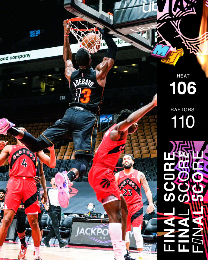 jrs直播网2月2日讯 NBA常规赛,猛龙主场迎战热火,两队三天前曾大战三个加时,最终猛龙艰难胜出,此役双方均是背靠背作战。首节热火反客为主取得10-3的不俗开局,猛龙之后虽略有复苏无奈防守不给力,热火很快取得了两位数的领先,次节阿丘瓦、特伦特等人轮番发威,几次将分差缩小到个位数,无奈节末阿德巴约大发神威连得6分,热火在半场结束时依旧保有12分的优势。第三节范弗里特终于复苏,他一人连砍11分带队打出一波14-3瞬间迫近比分,可惜球队罚球命中率不高错失了扳平的机会,热火靠着阿德巴约与巴特勒的强攻勉强维持住优势,末节西亚卡姆、阿丘瓦、特伦特三分如雨,猛龙一波10-0终于反超比分,纵使希罗此后带队连续追分却为时晚矣,阿奴诺比空接上篮杀死比赛。最终,猛龙110-106逆转击败热火取得三连胜。