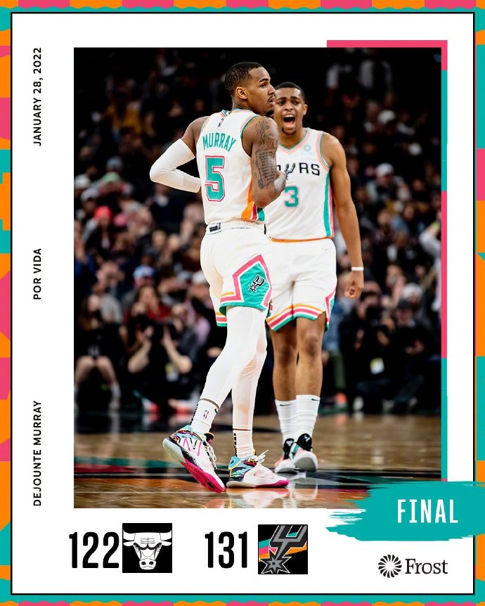 马刺(19-31):穆雷29分9篮板12助攻、珀尔特尔21分11篮板、约翰逊23分8篮板、麦克德莫特11分、怀特14分9助攻、沃克11分、瓦塞尔11分