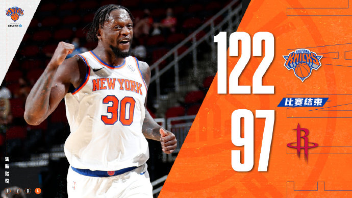 jrs直播网5月3日讯 NBA常规赛,火箭主场迎战尼克斯。火箭被库里单节发力击败后,近7场输掉其中6场,球队也是继续稳居联盟垫底。而尼克斯最近状态不错,高居东部第四,过去11场比赛赢得了其中的10场。一开场,火箭多点开花取得领先,尼克斯在兰德尔的带领下奋力反击,连续打出进攻高潮反超比分,首节结束尼克斯领先10分。第二节,尼克斯延续火力继续拉开分差,奥利尼克里突外投带队苦苦追赶,半场打完尼克斯59-44领先15分。下半场,火箭持续发力一度把分差缩小到个位数,兰德尔单节15分帮助尼克斯领先22分结束第三节。第四节,尼克斯不断发力继续扩大优势,分差超过30分,比赛早早失去悬念。最终,尼克斯击败火箭,客场带走胜利。
