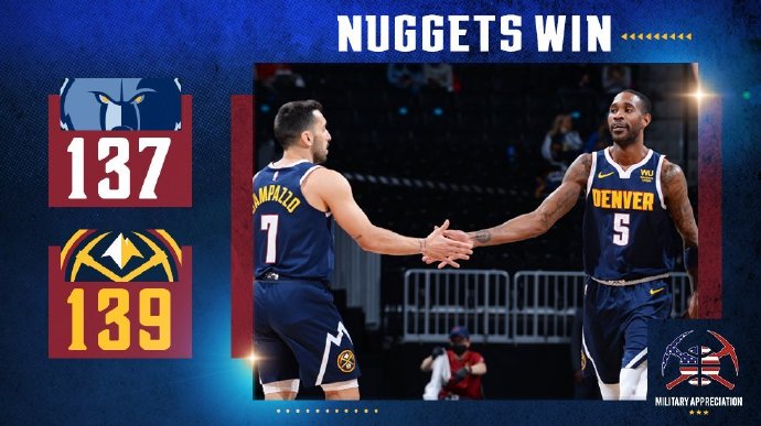 掘金(37-20):约基奇47分15篮板8助攻、巴顿28分7助攻6篮板、波特21分7篮板、米尔萨普12分5篮板2助攻、格林12分5篮板、多齐尔10分5篮板5助攻