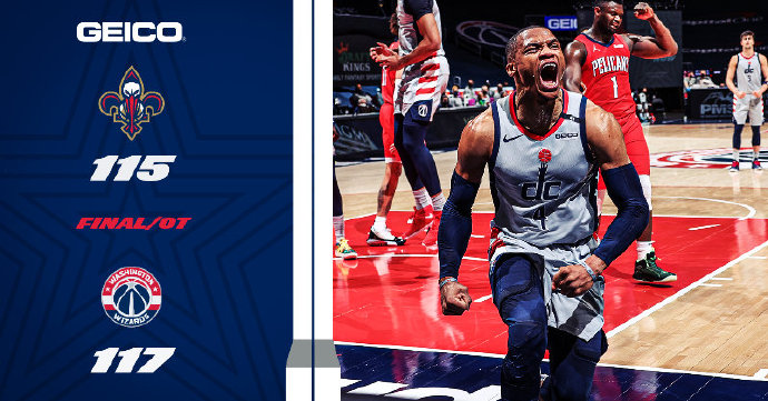 jrs直播网4月17日讯 NBA常规赛,奇才主场迎战鹈鹕,前者2连胜排在东部第12位,后者上场不敌尼克斯暂列西部第11,球哥今天复出。首节双方上来就展开对攻拉锯战,鹈鹕一直稍稍保持领先,但加福德的出色发挥帮助奇才反超1分,次节开局鹈鹕陷入得分荒,奇才抓住机会打出一波进攻高潮直接建立双位数领先,但末段鹈鹕一波7-0又把分差追至1分。半场归来,前半段双方展开拉锯战,威斯布鲁克帮助奇才占据领先,但后半段鹈鹕通过一波11-0小高潮反过来建立3分的领先进入末节,末节鹈鹕还是杀奇才内线将领先优势扩大,威斯布鲁克和比尔苦苦支撑奇才进攻,但两人与加福德联手在最后时刻将比分扳平,各自绝杀球都不进,双方进入加时。加时赛,威斯布鲁克个人连拿8分帮助奇才奠定优势,但鹈鹕马上通过罚球追平比分,威少造犯规罚球绝杀,最终奇才加时险胜鹈鹕,拿到3连胜。