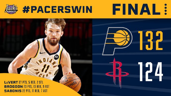 jrs直播网4月15日讯 NBA常规赛,火箭坐镇主场迎战步行者,火箭已经遭遇三连败,步行者则刚刚输给快船,本场特纳因伤缺阵。开场两队即火力全开,但步行者明显延续性更好,内外兼备,勒韦尔和霍勒迪各中两记三分,萨博尼斯则在禁区翻江倒海,很快带领球队获得领先,火箭则由沃尔连得九分止血,首节结束步行者33-24领先。次节上来,步行者打出小高潮,一举领先到20分,火箭则由波特,沃尔,伍德轮番单打止血,兰姆本节手感火热,连续投中,半场结束,步行者75-55保持20分领先。易边再战,奥利尼克开局连得七分,步行者则延续上半场火热手感,连续命中远投,火箭不断进攻禁区蚕食分差,步行者由萨博尼斯连续在内线单打命中,三节结束,分差缩小到12分。步行者106-94领先。末节火箭内突外投,打出一波攻势,将分差缩小到个位数,此后两队陷入拉锯战,分差维持在十分上下没能继续迫近,萨博尼斯篮下扣篮基本杀死比赛,最终步行者132-124战胜火箭,送给对手四连败。