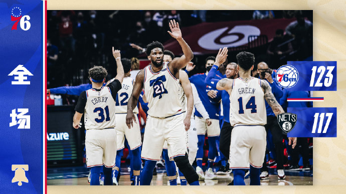 jrs直播网4月15日讯 今日NBA常规赛,篮网客场挑战76人,本场比赛欧文复出,杜兰特格里芬轮休。比赛开始后,76人率先发力取得9分领先,欧文首节发挥出色,自己得分的同时不断串联队友,篮网始终紧咬比分,首节结束76人32-28领先篮网4分。第二节比赛前半段,托拜亚斯-哈里斯里突外投接连得分,恩比德后半段发力接连站上罚球线,篮网半场58-65落后7分。下半场比赛开始后,篮网进攻效率降低,76人内外兼修不断扩大领先优势,分差一度来到16分,之后欧文发力连续得分替篮网缩小分差,三节战罢,篮网依然落后76人10分。最后一节,76人保持出色外线手感,接连打出进攻高潮将分差扩大至20分,篮网之后发起反扑一度将分差缩小至3分,76人依靠罚球稳住胜局,最终76人123-117主场击退篮网。