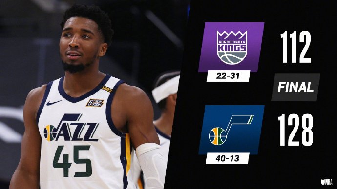 爵士(40-13):米切尔42分3篮板4助攻,康利26分6篮板4助攻,奥尼尔5分14篮板3助攻,戈贝尔6分11篮板,博格达诺维奇8分6篮板3助攻,英格尔斯20分3篮板6助攻,尼昂12分2篮板,费沃斯6分7篮板。