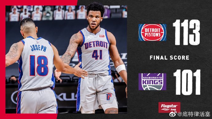 jrs直播网4月9日讯 NBA常规赛,国王今日迎战活塞,前者四连败后排在西部第十二位,而后者上场比赛则是输给了掘金,继续在东部垫底,本场格兰特、普拉姆利和巴格利等人缺战。比赛上来两队便陷入拉锯战,场上比分交替领先,首个暂停之后活塞逐渐取得场上的微弱领先,在进入次节后活塞完全占据场上主动,分差也一度达到了二十分,半场结束时场上分差为18分。易边再战,国王多次发起反扑攻势,分差最小时仅剩7分,不过却始终没能更进一步,最终活塞力克国王送给后者五连败。