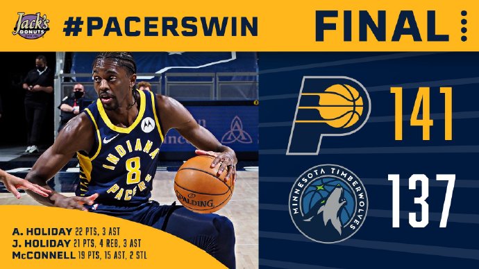jrs直播网4月8日讯 今日NBA常规赛,步行者主场迎战森林狼,本场比赛步行者小萨博尼斯在内的多名主将缺战。比赛开始后,双方便进入对攻模式,森林狼内外兼修,而步行者则不断冲击内线始终紧咬比分,随着马丁反击断球打成二加一,步行者领先4分结束首节。次节回来后,森林狼进攻效率降低,连续投篮打铁,步行者则多点开花,抓住机会一度将分差扩大至21分。下半场回来后,森林狼找回进攻状态,唐斯里突外投连续得分,步行者则稳扎稳打始终保持十分以上领先优势,三节战罢,步行者109-94仍然保持15分领先。最后一节,爱德华兹率先发力连得7分,步行者外线发力接连命中3记三分,依靠外线火力浇灭森林狼反扑势头,最后时刻,麦康纳弧顶甩进压哨三分杀死比赛。最终,步行者141-137战胜森林狼捍卫主场。