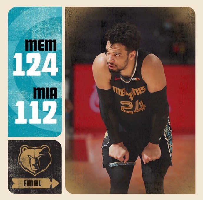 灰熊(25-23):狄龙28分,瓦兰丘纳斯20分10篮板2抢断,安德森19分7篮板6助攻,莫兰特10分4篮板4助攻,阿伦8分3助攻,贝恩15分3篮板3助攻,蒂尔曼11分6篮板。