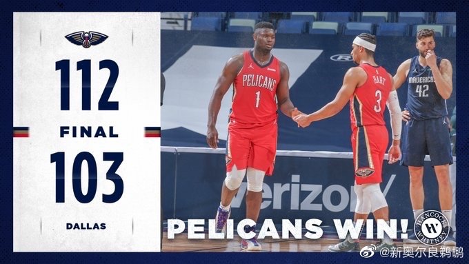jrs直播网3月28日讯 NBA常规赛,鹈鹕主场迎战独行侠,两队上一场比赛都输给各自对手,前者目前排名西部第12位,后者目前排名西部第7位,本场比赛东契奇、波尔津吉斯都缺阵,鲍尔也是继续不打。开局上来两队就展开拉锯战,比分一直拉不开,末段鹈鹕一波13-0的进攻高潮建立15的领先优势进入次节,次节中段独行侠也打出一波17-0的攻击波直接反超比分,锡安连续冲击内线帮助鹈鹕打平独行侠进入下半场。易边再战,独行侠开局又打出小高潮取得领先,锡安和布莱德索连续得分抹平分差,依靠锡安连续突内线杀伤,鹈鹕只领先2分。末节双方还是展开胶着拉锯战,末段鹈鹕靠防守打出一波9-0一举奠定胜局,最终鹈鹕击退独行侠。