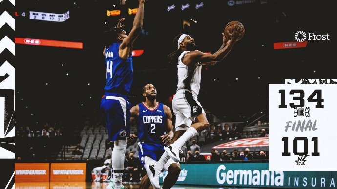 jrs直播网3月25日讯 NBA常规赛,马刺坐镇主场迎战快船,马刺最近2连败已经掉落至西部第7位,快船则是2连胜上升到西部第3位,本场比赛盖伊缺战。首节快船三分手感火热,小莫里斯独中4记三分,末段马刺一波小高潮追回一些分差,快船还是领先12分,次节双方提高防守强度命中率都有所下降,分差围绕在10分左右,快船凭借最后1分钟的进攻波半场结束继续领先14分。易边再战,快船进攻状态一直不错,替补的三分手感帮助快船三节结束将分差扩大至18分,末节快船牢牢守住20分的优势,中段双方就换上替补练兵,最终快船大胜马刺,拿到3连胜的同时送给对手3连败。