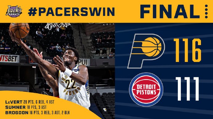 jrs直播网3月24日讯 步行者主场迎战东部“副班长”活塞,目前步行者排名东部第10,距离第8的凯尔特人还有1.5个胜场,此役他们也是势在必得。首节步行者在打了一波8-0攻势后进攻突然断电,活塞抓住机会在艾灵顿的带领下回敬一波13-2将比分反超,次节两队开始三分对飚大战,比攻击火力显然还是步行者的火力更猛,布罗格登、勒韦尔先后开张掀起个人得分秀,步行者单节净胜9分反超比分。第三节,步行者一度将分差拉大到两位数,然而活塞却在萨迪克-贝和格兰特的率领下打出13-3的小高潮迫近比分,末节萨迪克-贝的三分让活塞一度完成反超,此时步行者的角色球员萨姆纳连得12分带领球队度过难关,之后萨博尼斯和勒韦尔又相继爆发,活塞虽竭力追赶却在最后时刻出现失误,勒韦尔大心脏三分杀死比赛,最终步行者主场111-106击败活塞。