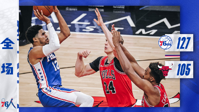 jrs直播网3月12日讯 NBA常规赛公牛主场对阵76人,本场比赛76人的恩比德和西蒙斯双双缺阵,开场后两队你来我往互不相让,不过76人依靠整体发挥逐渐取得领先。第二节虽然公牛一度依靠马尔卡宁、怀特和拉文三人的三分追平比分。但哈里斯带领76人稳住节奏,上半场76人64-57领先公牛。下半场回来76人仍旧占据场上主动,虽然赛迪斯-杨频频砍分也只是帮助公牛没有被拉大分差,第四节开始科克马兹和霍华德更是带领轮换阵容打出一波高潮直接锁定胜局,最终76人127-105轻松拿下公牛。