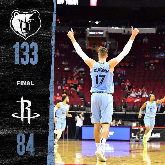 灰熊:布鲁克斯8分2板3助,安德森13分5板,瓦兰丘纳斯6分6板,贝恩15分7板3断,莫兰特6分7助3断,梅尔顿14分3板5助4断,温斯洛20分3板,克拉克16分12板,泰厄斯-琼斯13分5板2助2断,吉昂12分3板