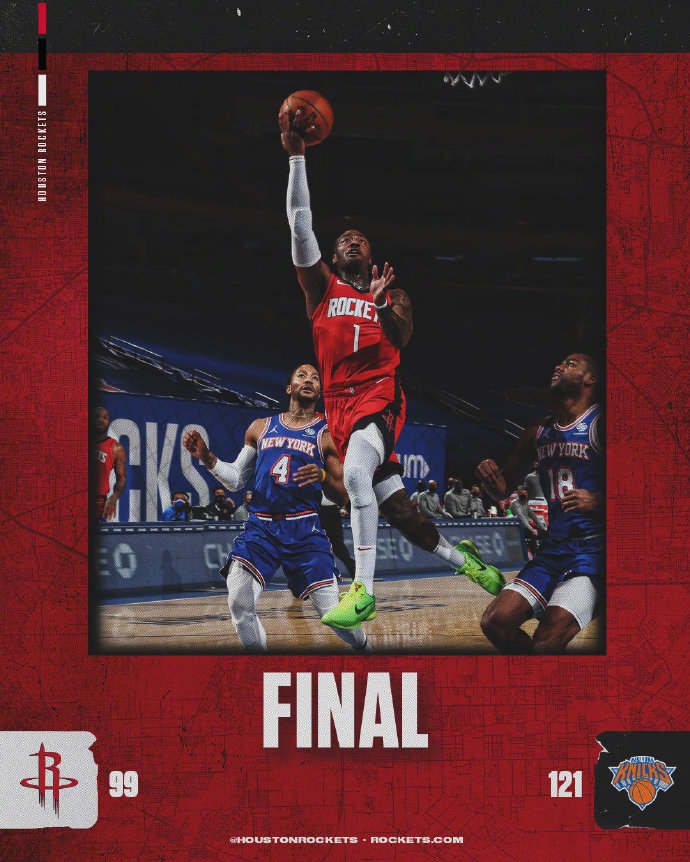 jrs直播网2月14日讯 NBA常规赛,尼克斯今日迎战火箭,前者上场比赛战胜奇才排在东部第八位,而后者已经遭遇四连败下滑至西部第十三位,本场奥拉迪波和伍德均因伤缺战。比赛上来两队经过短暂拉锯,不过暂停之后尼克斯便开始发力,尤其是外线连续命中远投,次节更是将分差拉大到了两位数。易边再战,火箭在沃尔的带领下一度将分差缩小回个位数,但并没能一举实现反超,稳住阵脚的尼克斯末节直接将分差扩大到了二十分以上,比赛彻底失去悬念,最终尼克斯大胜火箭,送给后者五连败。