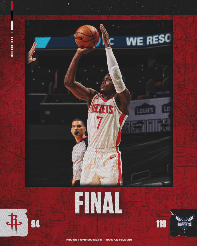 jrs直播网2月9日讯 火箭今日奔赴夏洛特客场挑战黄蜂,火箭这边除了受伤的伍德外,沃尔和戈登全都轮休缺阵。缺少多名核心的火箭在开局的对攻中虽然落入下风但表现顽强一直咬住比分,次节在麦克勒莫爆发单节砍下15分的带动下一度反超比分,不过黄蜂这边鲍尔同样有着出色发挥,他半场15分5助的表现帮助黄蜂及时稳住局势并带着4分领先进入下半场。第三节的火箭虽然继续落后但打的很顽强,节末也一度追平了比分,然而第四节初莫名的哑火直接导致溃败,他们开局前7分钟里仅得1分,而黄蜂抓住机会送出19-1的攻势一举拉开比分奠定胜局,火箭这一节仅得7分。最终,黄蜂主场轻取火箭拿下比赛。