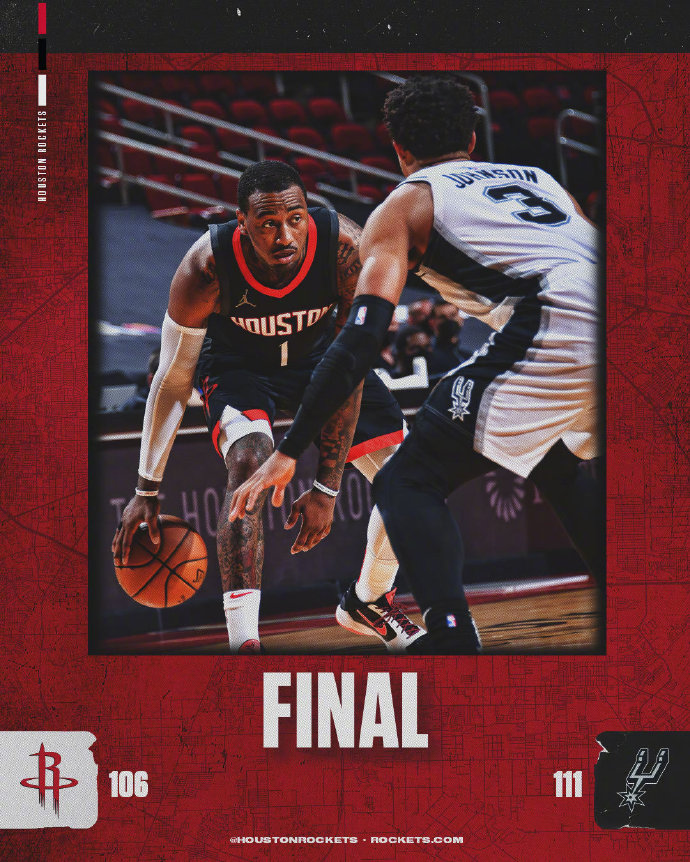 jrs直播网2月7日讯 NBA常规赛火箭主场对阵马刺,本场比赛阿尔德里奇和沃克都不出战,伍德也因伤缺阵。开场后马刺率先打出攻势取得领先,考辛斯和戈登接连射中三分咬住比分,第二节两队手感都比较一般,盖伊在外线三分手感不错,不过沃尔和考辛斯为火箭追分,上半场马刺51-47领先4分。下半场回来场上局势仍旧胶着,两队手感恢复不断拿分,第四节火箭一度完成反超,不过马刺最后关头顶住压力拿下比赛胜利,最终马刺111-106险胜火箭。