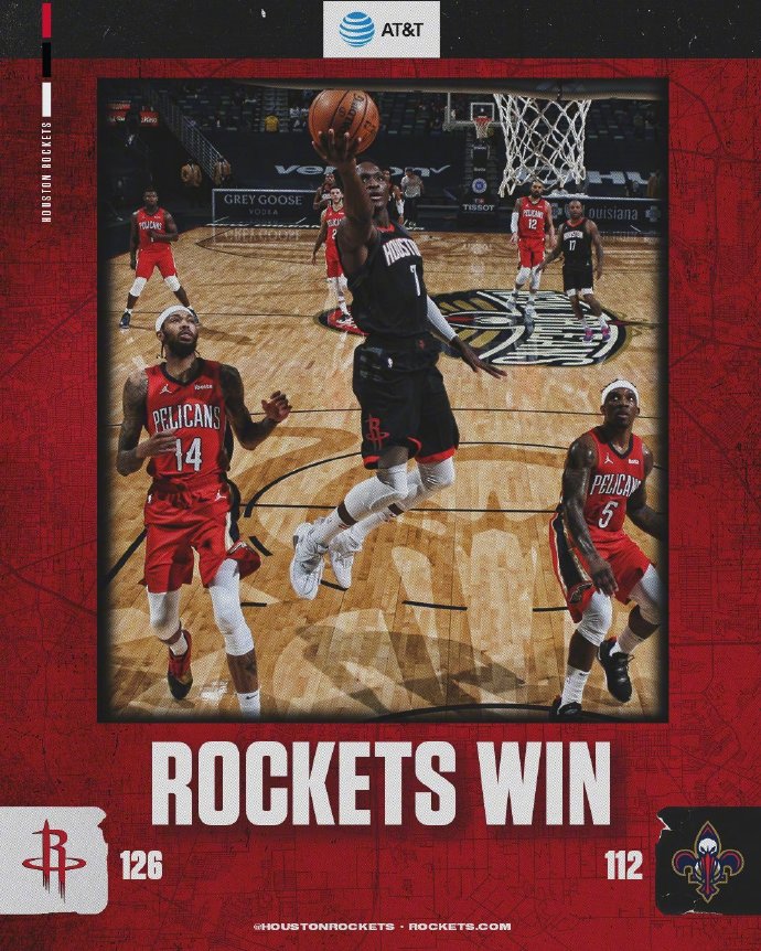 jrs直播网1月31日讯 NBA常规赛,鹈鹕今日迎战火箭,前者两连胜后排在西部倒数第二位,而后者更是一波四连胜后来到西部第十的位置。比赛上来鹈鹕就率先进入状态取得领先,分差也是逐渐达到两位数,但进入次节火箭在进攻端突然爆发,单节爆砍48分实现反超并建立起18分的优势结束半场。易边再战,火箭始终掌握着场上的主动权,分差也是被继续扩大到二十分以上,比赛早早失去悬念,最终火箭大胜鹈鹕,迎来五连胜。