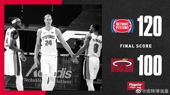 jrs直播网1月17日讯 热火坐镇主场迎战活塞,此役巴特勒、希罗因健康协议缺阵。两队上半场打得十分胶着,热火凭借纳恩和阿德巴约在次节末连续得分,以56-52稍稍领先结束半场。易边再战,热火在第三节命中率下滑,活塞则找到外线手感,格兰特、格里芬和罗斯等连中三分,活塞凭借凶猛的外线火力单节净胜19分,取得两位数领先。末节热火仍未找回进攻节奏,而活塞延续着手感,罗斯、约什-杰克逊和贝等一众替补再轰进三分,帮助活塞把领先扩大到20分以上,就此锁定胜局。最终,活塞在客场以120-100大胜热火,止住2连败的颓势,同时送给热火3连败。
