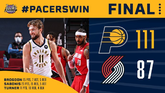 步行者:J-霍勒迪11分3板、萨博尼斯23分15板5助2断、特纳11分10板4帽、萨姆纳7分3板2助2断、布罗格登25分5板7助3断、麦克德莫特16分3板3助、麦康纳4分5板8助3断、A-霍勒迪6分3助、桑普森3分5板、斯坦利2分、马丁3分