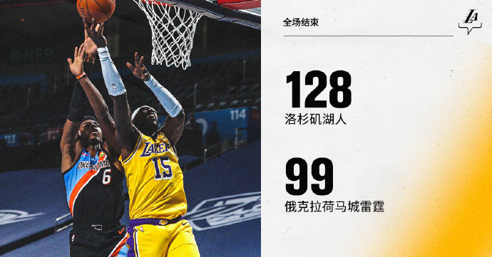 jrs直播网1月14日讯 湖人前往客场挑战雷霆,两队都是背靠背作战。上半场浓眉在内线频频得手,詹姆斯连中三分,两人率领湖人早早就建立起两位数领先。易边再战,湖人延续着手感,浓眉和詹姆斯继续予取予求,哈雷尔等角色球员亦连续砍分,多点开花的湖人把领先扩大到20分以上,攻防两端全面处在下风的雷霆毫无抵抗之力。最终,6人得分上双的湖人兵不血刃地以128-99大胜雷霆,取得4连胜。