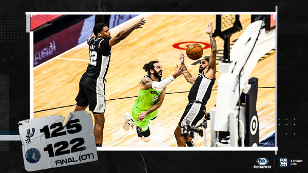 jrs直播网1月10日讯 NBA常规赛森林狼主场对阵马刺,开场后两队就多次命中三分,森林狼率先取得领先,第二节森林狼连续强攻内线守住优势,不过马刺在德罗赞和穆雷的带领下仍旧完成反超,上半场马刺60-58领先森林狼。下半场场上局势僵持不下,两队多次交替领先,拉塞尔射中关键三分帮助森林狼取得领先,最后时刻德罗赞制造犯规全部罚进将比分追平,拉塞尔绝杀不中,双方进入加时,加时赛米尔斯手感火热,不过比斯利也是连中三分,最后森林狼追分未果,马刺125-122加时击败森林狼。