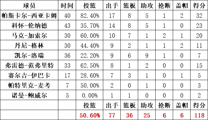 猛龙(1-0):西亚卡姆32分8篮板5助攻2盖帽、莱昂纳德23分8篮板5助攻、加索尔20分7篮板、丹尼-格林11分2篮板、洛瑞7分6篮板9助攻、范弗里特15分2助攻、伊巴卡5分3篮板、麦考3分、鲍威尔2分。