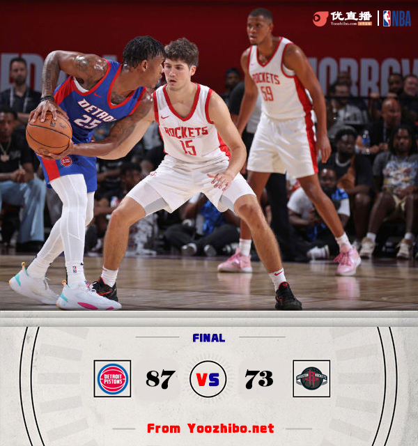 jrs直播网 7月16日讯 NBA夏季联赛,火箭主场对阵活塞。比赛开始,双方进攻端都比较慢热,谢泼德上篮为火箭开局,双方打了半节各自仅得6分,随后火箭抓住机会一波9-0小高潮反超比分,首节火箭领先3分,次节双方还是找不到进攻状态,惠特摩尔还是没有运动战进球,双方展开拉锯战,丹尼斯-詹金斯里突外投扛起活塞进攻,半场活塞反超1分。下半场,双方进攻端终于找回状态展开拉锯战,37号秀克林特曼接连取分,而AJ-格里芬也找到手感单节砍下9分回应,惠特摩尔终于有运动战进球,三节火箭反超1分,末节活塞上来12-0直接建立主动权,打了半节谢泼德罚篮终于破荒,随后双方又接连打铁,活塞还是能掌握住双位数领先,最终活塞87-73力克火箭。