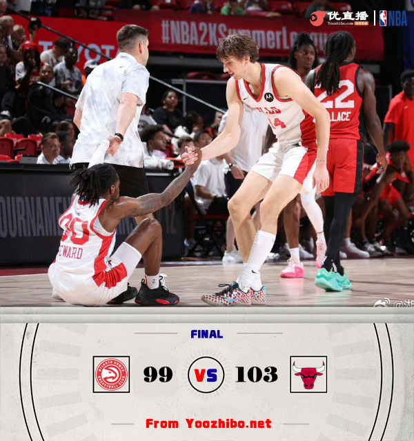 jrs直播网 7月20日讯 NBA夏季联赛,老鹰对阵公牛。选秀大会上老鹰摘得状元秀里萨谢,而公牛拿到11号秀布泽利斯。本场比赛里萨谢缺阵。比赛开始,公牛率先发力打出9-2开局,随后老鹰接连三分追分,斯图尔特手感火热外线能给出回应拉开双位数领先,首节公牛领先7分,次节双方展开拉锯战,菲利普斯接连扔进三分,公牛越打越好,一波10-3领先到15分。下半场,双方你来我往,公牛还是保持十几分领先,温德勒里突外投连砍6分带领老鹰一波8-2追至个位数分差,三节公牛还领先8分,末节老鹰开始追分,鲍登成为替补奇兵,老鹰9-0一度反超比分,但斯图尔特接连三分止血,双方展开胶着拉锯战,关键时刻华莱士和鲍登又接连扔三分反超2分,斯图尔特两罚再追平,双方96平进入加时。加时赛率先得到7分的球队获胜,菲利普斯三分命中后温德勒迅速回应,布泽利斯两罚后斯图尔特抛投绝杀,最终公牛加时103-99险胜老鹰。