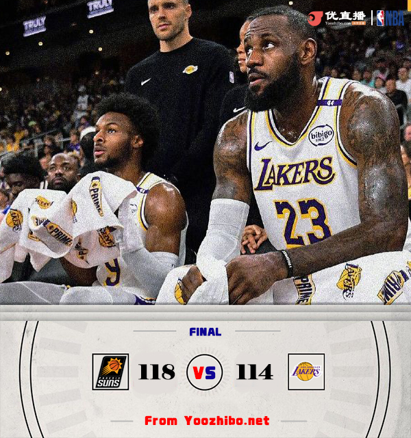 jrs直播网10月7日讯 NBA季前赛,太阳对阵湖人。比赛刚上来戴维斯就完成一记空接暴扣,随后詹姆斯连续大帽普拉姆利和布克,湖人先声夺人,布克外线连飙三分,拉塞尔和里夫斯先后砍分回应帮助湖人巩固优势。第二节上来布朗尼登场迎来NBA首对父子同台,太阳连续通过三分追分,詹姆斯不仅自己进攻拿分还为队友送出助攻,太阳多次缩小分差但湖人总能及时回应将比分又拉开。下半场湖人替补表现不佳,太阳继续努力追分,最后2分钟湖人崩盘被太阳反超比分,湖人手握绝平机会也没有把握住,最终太阳118-114逆转湖人。