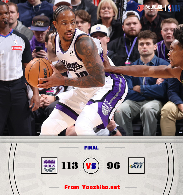 jrs直播网10月30日讯 NBA常规赛,国王客场挑战爵士。国王目前1胜2负,爵士则遭遇开赛3连败。上半场,小萨率先发力,单节5中5独得10分帮助球队取得两位数领先,次节双方展开对攻,爵士连中三分一度将分差缩小到只剩3分,国王内外开花稳住局势,半场战罢国王61-52领先爵士。下半场,爵士进攻完全哑火,国王火力全开一举将分差拉开到20分以上,末节德罗赞连续中投得手帮助球队保持着大比分的领先,爵士无力回天。最终,国王113-96轻取爵士,送给对手4连败。