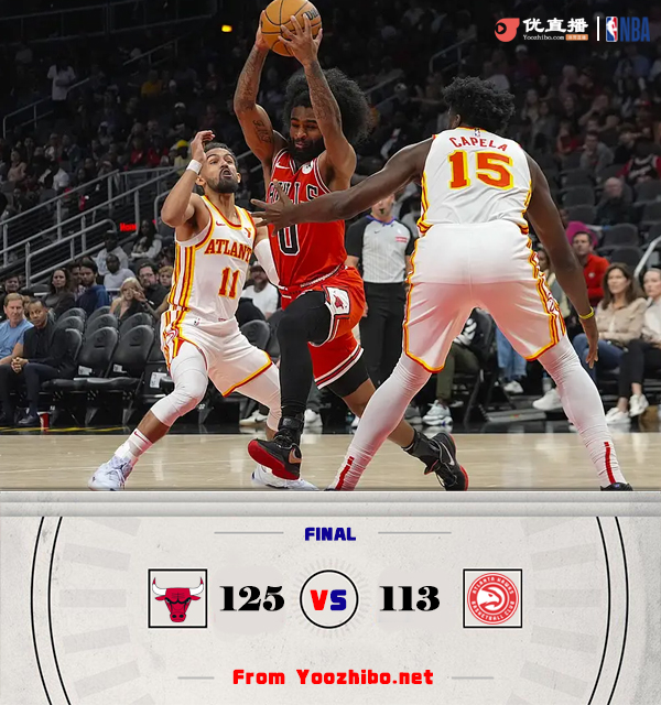 jrs直播网11月10日讯 NBA常规赛,公牛对阵老鹰,公牛最近遭遇4连败,老鹰上场比赛惜败活塞。开场后老鹰在特雷-杨的带领下首先打出攻势,特雷-杨自己出手不多但连连为队友送出精彩助攻,卡佩拉在内线也是表现相当活跃,公牛主要依靠拉文和武切维奇的单打追分。第二节回来两队手感都不错,连续在外线对飚三分,公牛虽然多点开花,但老鹰进攻也相当犀利没有给公牛缩小分差的机会,其中杰伦-约翰逊状态火热频频砍分。易边再战,老鹰延续状态以7-0开局,公牛经过暂停调整连续用三分稳住阵脚,第四节上来老鹰进攻断电,公牛趁势追击一波14-3的反扑完成反超,特雷-杨和杰伦-约翰逊凭借个人能力进攻也未能奏效,反倒是拉文和怀特关键时刻表现硬气先后拿分帮助公牛锁定胜局,最终公牛125-113逆转老鹰结束4连败,老鹰遭遇2连败。