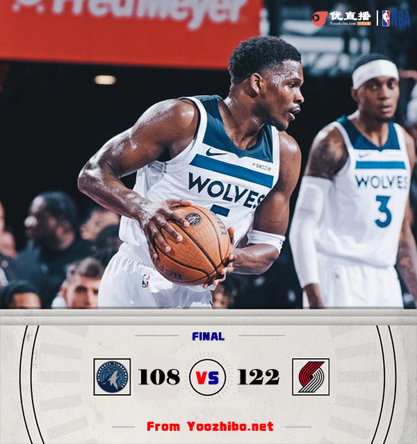 jrs直播网11月13日讯 NBA常规赛,森林狼对阵开拓者,森林狼上场被热火绝杀,开拓者最近遭遇3连败。开场后两队你来我往还打得势均力敌,不过森林狼第一节末段进攻断电,开拓者趁机建立起两位数领先。第二节爱德华兹带领森林狼找回进攻状态,里德手感火热也是连连砍分,不过开拓者状态也是相当火热,罗威内线活跃多次上演暴扣,班顿外线也是神准。下半场回来两队主力依旧打得势均力敌,开拓者凭借轮换阵容的发挥将分差拉大,森林狼只有里德状态不错。最后一节森林狼再次组织反扑,不过开拓者整体发挥依旧稳定,没有给森林狼追上比分的机会,最终开拓者122-108击败森林狼结束3连败。