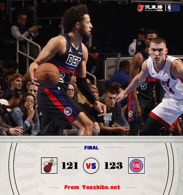 jrs直播网11月13日讯 NBA东部NBA杯B组,活塞主场迎战热火,本场比赛巴特勒因伤缺阵。比赛开始,热火首发极其不在状态,活塞上来就打出10-0梦幻开局,随后热火替补开始追分,但约维奇意外受伤流血离场,哈里斯手感不错带领活塞能回应,首节活塞领先11分,次节活塞上来又是7-0拉大领先,随后热火外线多点开花连中4记三分一度反超比分,但康宁汉姆接连送妙传助队半场稳住6分领先。下半场,双方展开拉锯战,小哈达威又受伤流血离场,但康宁汉姆有攻有传,活塞接连三分命中还是领先到9分,末节双方围绕着10分左右分差再次展开拉锯战,最后时刻希罗接连3记三分直接将比赛拖入加时。加时赛,双方继续拉锯战,杜伦两罚不中后热火领先到3分,但比斯利三分再追平,希罗准绝杀后被杜伦空接暴扣扳平,热火没暂停但斯波进场喊暂停被吹T,最终热火加时121-123惜败活塞。