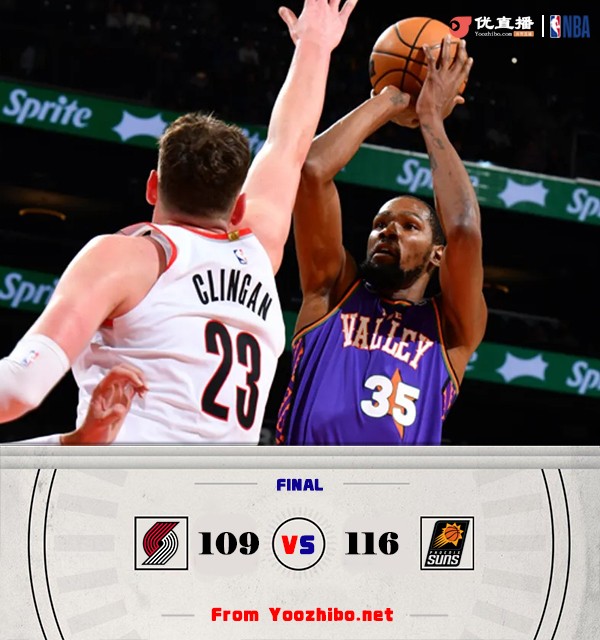 jrs直播网讯北京时间12月16日讯 NBA常规赛,开拓者对阵太阳,开拓者近况不加遭遇5连败,太阳上场比赛在杜兰特复出的帮助下力克爵士。开场后布克三分先声夺人,随后杜兰特接连砍分帮助太阳建立领先,开拓者多点开花紧追不舍,但第一节尾声太阳外线又是一波三分将分差拉大到两位数。第二节上来开拓者内外开花一路将分差追到只差2分,克林根内线连续上演暴扣,布克和奥尼尔先后命中三分为太阳止血。易边再战,开拓者延续反扑势头,上来就是一波11-0的攻势反超比分,布克内突外投连连砍分帮助太阳夺回领先。第四节太阳多点开花再度掀起攻势将分差拉大到两位数,虽然开拓者最后时刻一度又缩小分差,但时间所剩无几,最终太阳116-109送开拓者6连败。