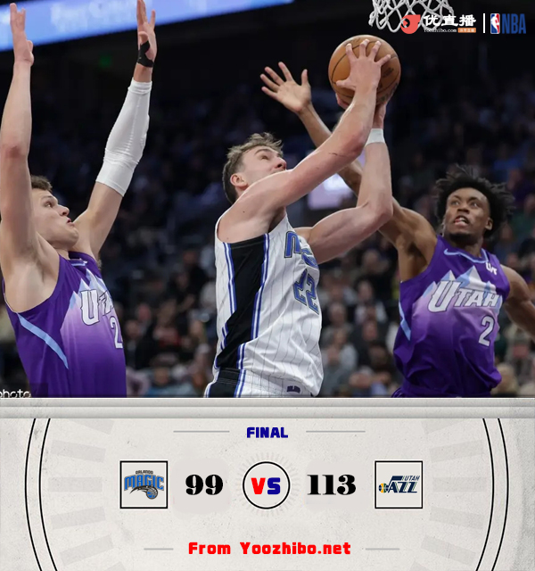 jrs直播网2月2日讯 NBA常规赛,爵士主场迎战魔术,爵士目前8连败后10胜36负西部垫底,魔术则是2连败后24胜25负排名东部第8。比赛开始,双方上来很是慢热,进攻端连续打铁,小瓦靠罚球止血,但爵士科林斯和凯斯勒接连送暴扣,马尔卡宁外线也接连发炮顺势拉开双位数领先,次节魔术进攻端继续不在状态,主力疯狂打铁,反倒是爵士多点开花扩大领先,席尔瓦抢断后压哨三分助队半场追到差12分。下半场,班凯罗进攻端还是铁,爵士抓住机会接连打成转换,一波8-0小高潮领先到20分以上,随后魔术接连罚球止血,三节魔术还落后16分,末节小瓦接连造杀伤罚球追分,但爵士总能回应一度又拉开20分以上领先,小瓦格纳里突外投单节砍下15分追分,但无奈分差太大,最终爵士113-99力克魔术,终止8连败同时送对手3连败。