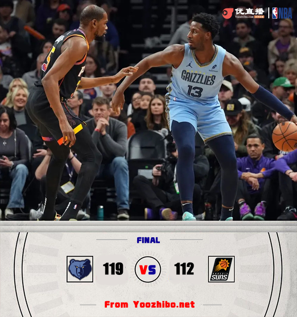 jrs直播网2月12日讯 NBA常规赛今日继续开打,太阳坐镇主场迎战灰熊。太阳近期状态再度回落,一度冲进西部前八的他们最近5场比赛输掉4场跌到西部第11位,不过本场比赛杜兰特伤愈回归;灰熊虽然在上一场输给雷霆但目前仍然排在西部第二位。首节之争灰熊反客为主早早进入状态,前期虽然优势不大但一直控制比赛,末段轮换阶段则接管比赛,他们连着4记三分送上一波18-7的攻势一举拉开两位数分差;次节杜兰特虽然砍下17分但球队防守端才是症结所在,灰熊虽然没有绝对高分但多点开花无视防守稳定输出,他们半场送出18次助攻足见进攻端的流畅度并带着12分领先进入下半场。休息归来灰熊前期一直占据上风一度拉开18分的领先,不过太阳在后半段逐渐起势蚕食分差,杜兰特第三节命中两记罚球达成个人生涯第三万分里程碑;末节决胜太阳两次追至4分但都没能再进一步,灰熊则连续关键球得分顶住压力并守住胜利。最终,灰熊客场击败太阳拿下比赛。