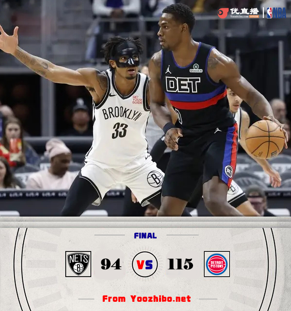 jrs直播网讯北京时间3月2日讯 NBA常规赛,活塞今日迎战篮网,前者上场比赛输给掘金,后者则是遭遇三连败,此役拉塞尔、小托马斯、克洛尼和艾维等人缺战。比赛上来,场上就呈现出一边倒的局势,篮网在半节的时间里只拿到4分,而活塞这边杜伦统治了攻防,在他的带领下球队也是打出19-4的完美开局,比斯利上场后连中三分,活塞单节轰下39分,次节活塞依旧占据着场上的主动权,分差也是突破了二十分,半场结束时篮网落后23分;下半场回来,活塞的进攻出现大问题,单节只拿到13分,尤其是三节节末连续出现失误被篮网追到个位数,末节活塞重整旗鼓,双方也是火药味十足,比斯利挑衅观众被驱逐,不过分差一直在十分以上,最终活塞轻取篮网,送给后者四连败。