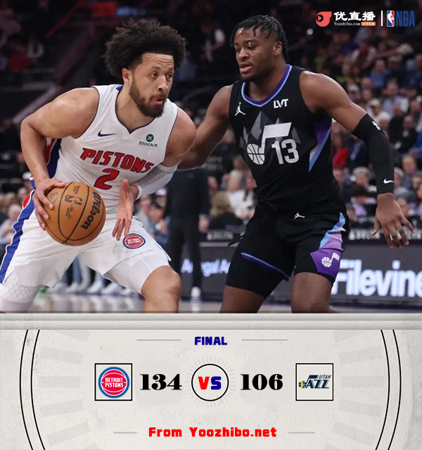 jrs直播网讯北京时间3月4日讯 NBA常规赛,活塞对阵爵士,活塞上场比赛轻取篮网稳居东部第六,爵士继续在西部垫底,上场输给鹈鹕。刚开场爵士在进攻端还打得有声有色,一度和活塞打得有来有回,但第一节后半段爵士失误开始增多,活塞多点开花迅速拉开比分,第一节爵士出现10次失误。第二节回来两队都先是选择冲击内线拿分,康宁汉姆得分组织一把抓,带领活塞再度掀起一波攻势将分差拉大到20分以上。易边再战,活塞在康宁汉姆的带领下攻势依旧不减,爵士也是多点开花紧追不舍。最后一节,塞克斯顿和菲利波夫斯基联手继续发起反扑,康宁汉姆和奥萨尔重新登场后帮助活塞再度将分差拉大到20分开外,比赛彻底失去悬念,最终活塞134-106大胜拿下爵士取得2连胜,爵士遭遇2连败。