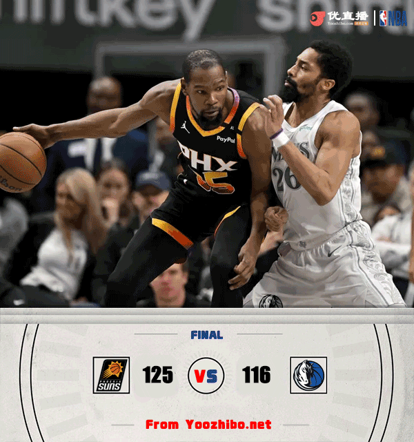 jrs直播网讯北京时间3月10日讯 NBA常规赛,独行侠主场迎战太阳。独行侠32胜32负排西部第10,已经遭遇4连败;太阳29胜34负紧随其后。比赛开始,双方开场势均力敌,比分交替领先,普拉姆利连续暴扣带队完成8-0的攻击波取得领先,次节双方围绕两位数的分差展开拉锯战,马绍尔高效发挥,太阳多点开花给出回应,半场战罢太阳60-54领先独行侠。易边再战,双方大打对攻,克莱连投带罚独得9分,杜兰特和比尔联手高效输出帮助太阳保持优势,末节太阳持续发力将分差拉开到16分,独行侠大势已去无力回天。最终,太阳125-116击败独行侠,送给对手5连败。