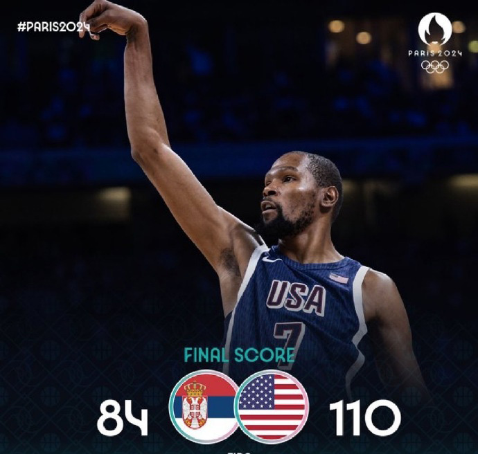 jrs直播网 7月29日讯 奥运男篮小组赛C组,美国男篮对阵塞尔维亚。比赛开始,塞尔维亚率先发力打出10-2的开局,科尔叫停调整换下恩比德,美国男篮随即轰出12-2强势反超,杜兰特手感火热连续拿分,次节詹姆斯和杜兰特依旧弹无虚发,美国男篮多点开花取得两位数领先,约基奇带队努力追赶,杜兰特压哨帮助美国男篮58-49领先结束上半场。易边再战,塞尔维亚命中率下降,美国男篮攻防两端优势明显不断扩大分差,末节阿德巴约暴扣将分差拉开到20分以上,塞尔维亚苦苦追赶无果。最终,美国男篮110-84击败塞尔维亚。